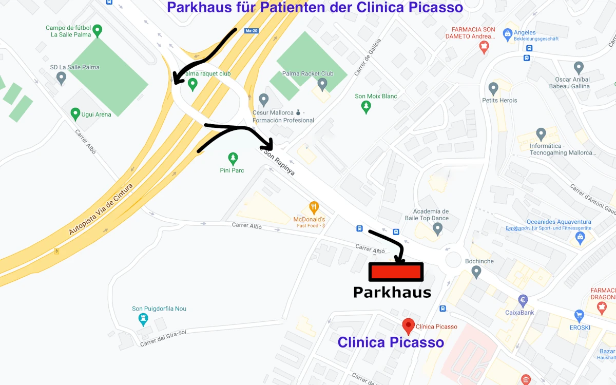 Desde Santa Ponsa, tome la salida 8 Son Rapinya. Gire hacia el centro de la ciudad y siga la línea verde y blanca, pasando el McDonald’s, hasta que vea la Clínica Salvà (Juaneda) justo antes de la rotonda a la derecha y tome la salida al parking. (Ver segunda foto)